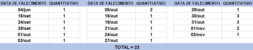 O boletim epidemiológico de hoje contabiliza 23 óbitos que ocorreram em diversas datas, conforme tabela abaixo. A existência de registros tardios e/ou acúmulo de casos deve-se a sobrecarga das equipes de investigação, pois há doenças de notificação compulsória para além da Covid-19. Outro motivo é o aprofundamento das investigações epidemiológicas por parte das vigilâncias municipais e estadual a fim de evitar distorções ou equívocos, como desconsiderar a causa do óbito um traumatismo craniano ou um câncer em estágio terminal, ainda que a pessoa esteja infectada pelo coronavírus.
